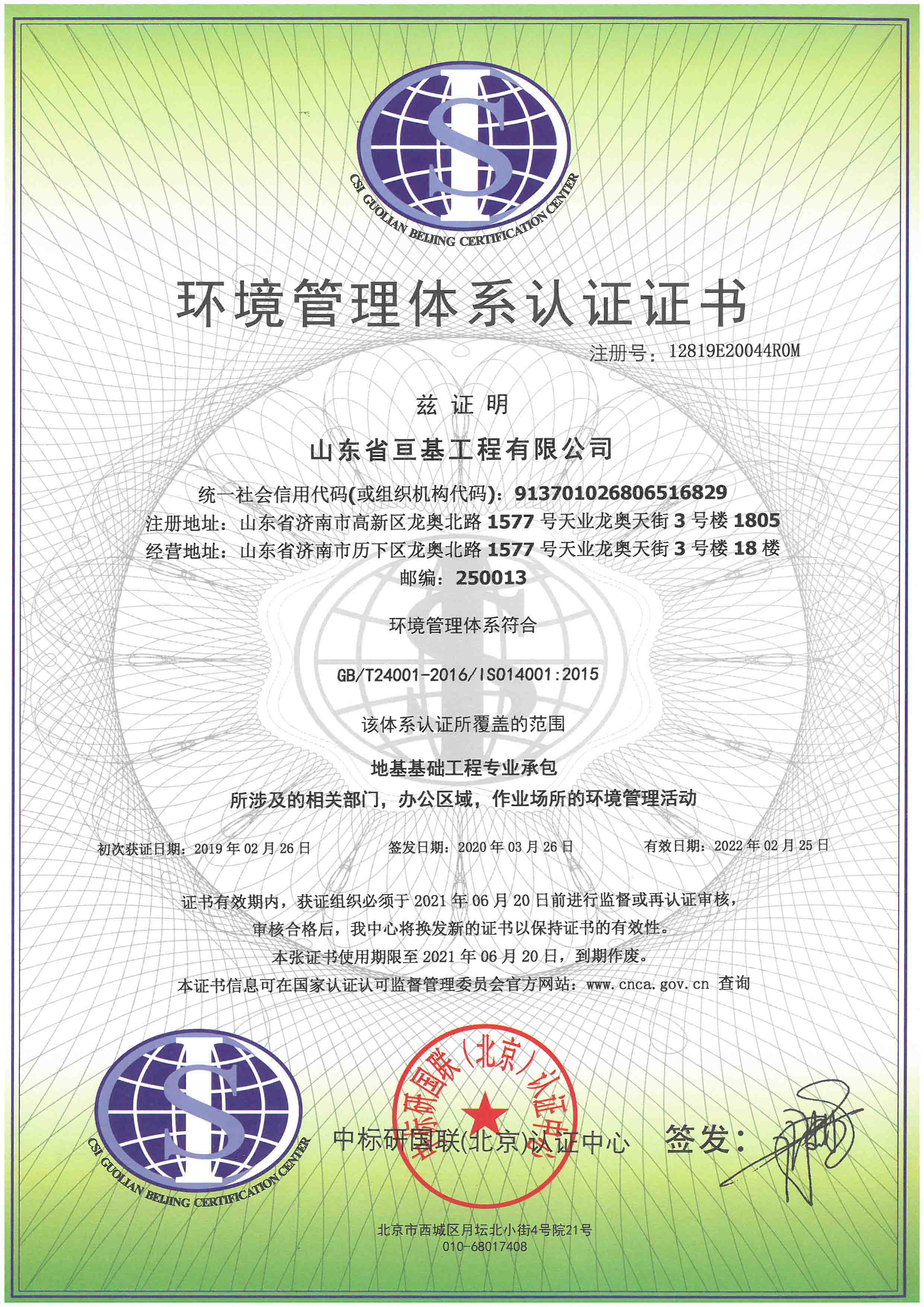 環(huán)境管理體系認(rèn)證證書